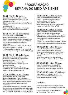 O município de Ribeirão das Neves, através da Prefeitura Municipal de Ribeirão das Neves, Secretaria Municipal de Meio Ambiente e Desenvolvimento Sustentável, realizará atividades celebrando o Dia Mundial do Meio Ambiente e o Lançamento da Agenda 21 Local.