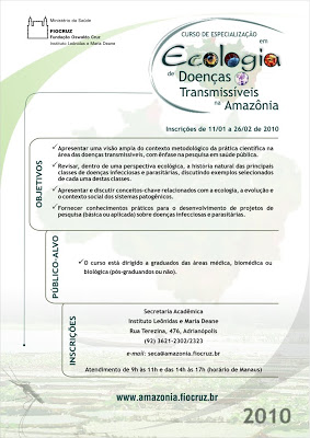 Até o dia 26 de fevereiro de 2010, estarão aberta as inscrições para o curso de especialização em Ecologia de Doenças Transmissíveis na Amazônia, promovido ...
