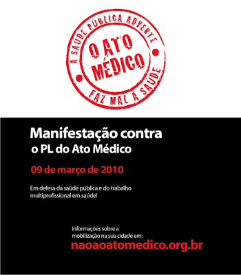 No próximo dia 09 de março (terça-feira), seguindo agenda nacional, Conselhos da área da Saúde (Biologia, Fonoaudiologia, Fisioterapia e Terapia Ocupacional, Psicologia, Educação Física, Nutrição, Farmácia) bem como os Sindicatos e estudantes dessas categorias, estarão se unindo contra o Ato Médico.