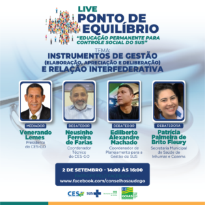 O Conselho Estadual de Saúde do Estado de Goiás irá promover a 2ª Live Ponto de Equilíbrio “Educação Permanente para o Controle Social do SUS” no dia 02 de setembro no formato online pelo facebook.