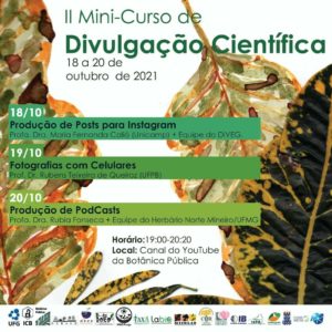 Entre os dias 18 e 20 de outubro ocorre o II Minicurso de Divulgação Científica, de 19h às 20h20, pelo canal do YouTube da Botânica Pública.