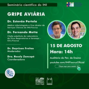 O Instituto Nacional de Infectologia Evandro Chagas (INI/Fiocruz) promove o “Seminário Científico sobre Gripe Aviária” no dia 15 de agosto de 2023, às 14h. O evento ocorrerá no auditório do Pavilhão de Ensino do Instituto, com transmissão ao vivo pelo canal oficial do INI no YouTube.