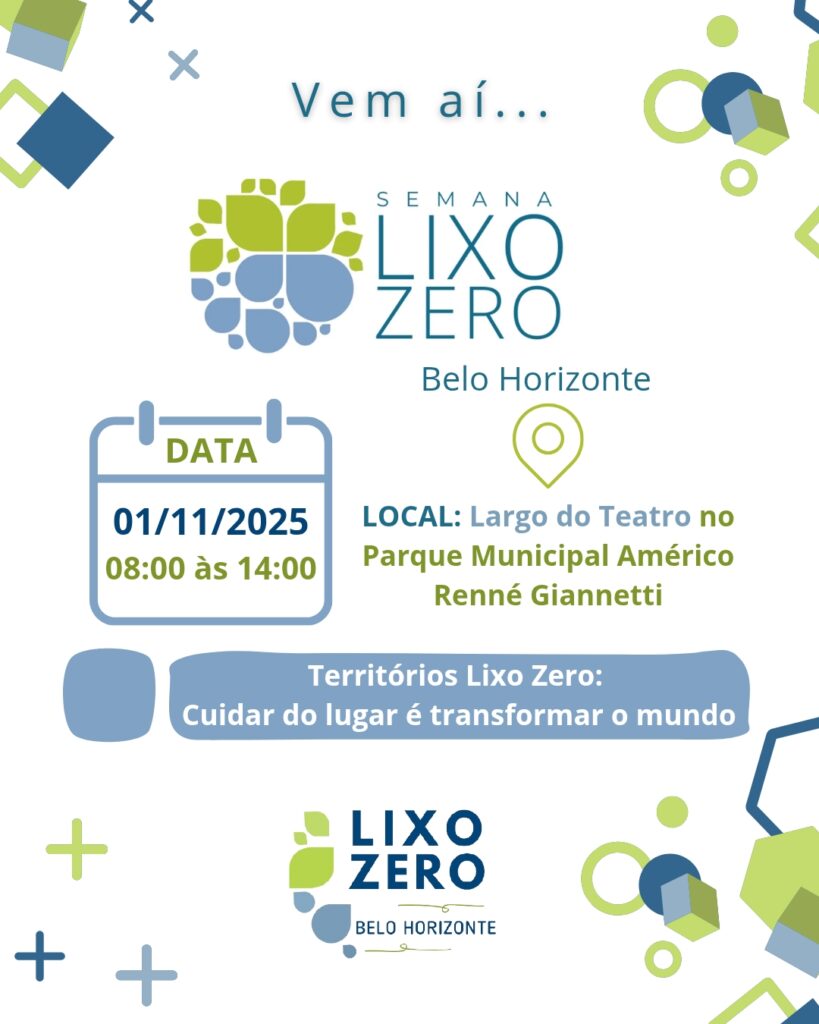 O Coletivo Lixo Zero Belo Horizonte realizará, no próximo sábado (01/11/2025), a Semana Lixo Zero BH, no Parque Municipal Américo Renné Giannetti, durante o período da manhã. A ação integra a campanha nacional promovida anualmente pelo Instituto Lixo Zero Brasil (ILZB), que estimula municípios de todo o país a desenvolverem atividades de conscientização sobre gestão de resíduos nos meses de outubro e novembro.
