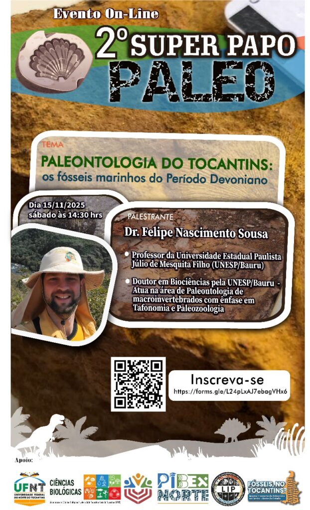 No dia 15 de novembro de 2025, será realizado o 2º Super Papo Paleo, que terá como tema “Paleontologia do Tocantins: fósseis marinhos do Período Devoniano”.