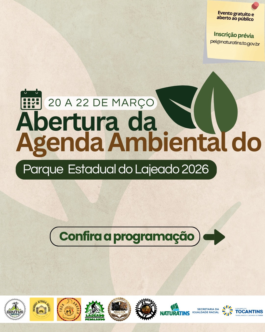 As atividades ocorrerão de 9h às 17h. O evento gratuito e aberto ao público, mas é necessária a inscrição prévia. Inscrições e mais informações: pel@naturatins.to.gov.br.